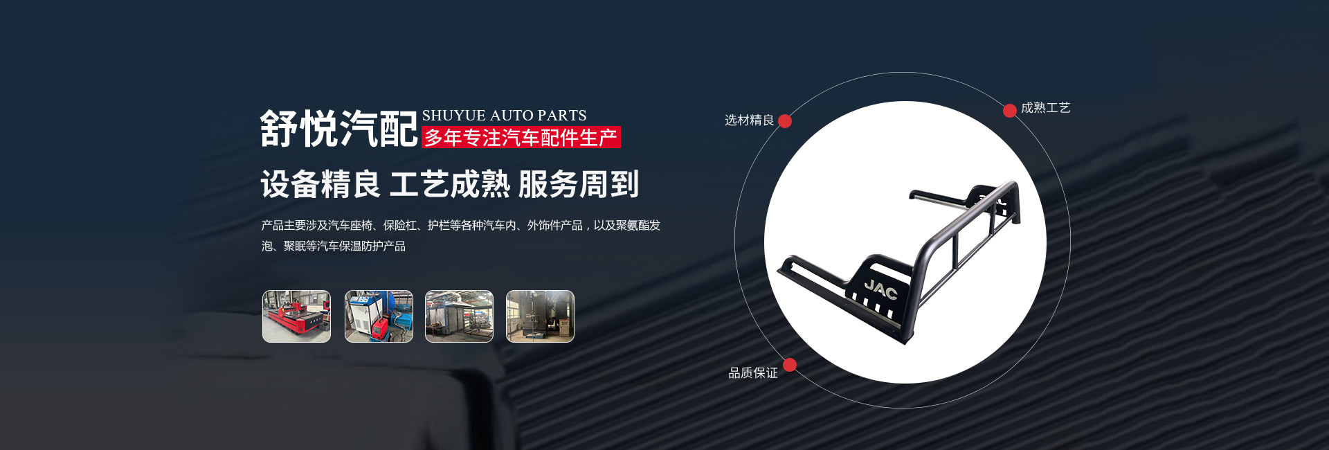 揚(yáng)州舒悅汽配有限公司經(jīng)過多年的穩(wěn)定發(fā)展,業(yè)績一直蒸蒸日上。公司產(chǎn)品主要涉及汽車座椅、保險(xiǎn)杠、護(hù)欄等各種汽車內(nèi)、外飾件產(chǎn)品,以及聚氨酯發(fā)泡、聚脲等汽車保溫防護(hù)產(chǎn)品。其主要是為江淮、金龍,奇瑞等公司服務(wù),已連續(xù)多年成為江淮、金龍等公司的A級(jí)供應(yīng)商。        公司成立于1997年,現(xiàn)坐落于揚(yáng)州市儀征劉集盤古工業(yè)集中區(qū)202號(hào),公司占地面積26640平 方米,廠房建筑面積18512平方米。公司擁有先進(jìn)的制造設(shè)備、可靠的生產(chǎn)工藝、完善的檢測(cè)手段和科學(xué)的管理,在售前和售后服務(wù)中做到快速反應(yīng),應(yīng)急應(yīng)變,為客戶提供優(yōu)良產(chǎn)品和滿意服務(wù)。公司的產(chǎn)品開發(fā)能力和生產(chǎn)規(guī)模在同行業(yè)中處于前列的地位。        揚(yáng)州舒悅?cè)吮小罢\信雙嬴”的原則,發(fā)揚(yáng)“誠信、務(wù)實(shí)、創(chuàng)新、貢獻(xiàn)”的企業(yè)精神,恪守“顧客至上”的經(jīng)營宗旨,致精從業(yè),不斷引進(jìn)新技術(shù)、新材料。以優(yōu)良的產(chǎn)品、合理的價(jià)格和周到的服務(wù)參與市場(chǎng)競(jìng)爭(zhēng)。公司愿與國內(nèi)外朋友建立真誠的合作伙伴關(guān)系,攜手共創(chuàng)輝煌!